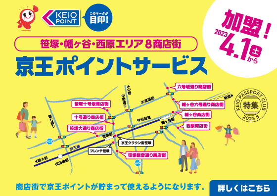 商店街で京王ポイントが貯まって使えるようになります。※一部店舗に限ります。対象店舗は順次拡大予定です。